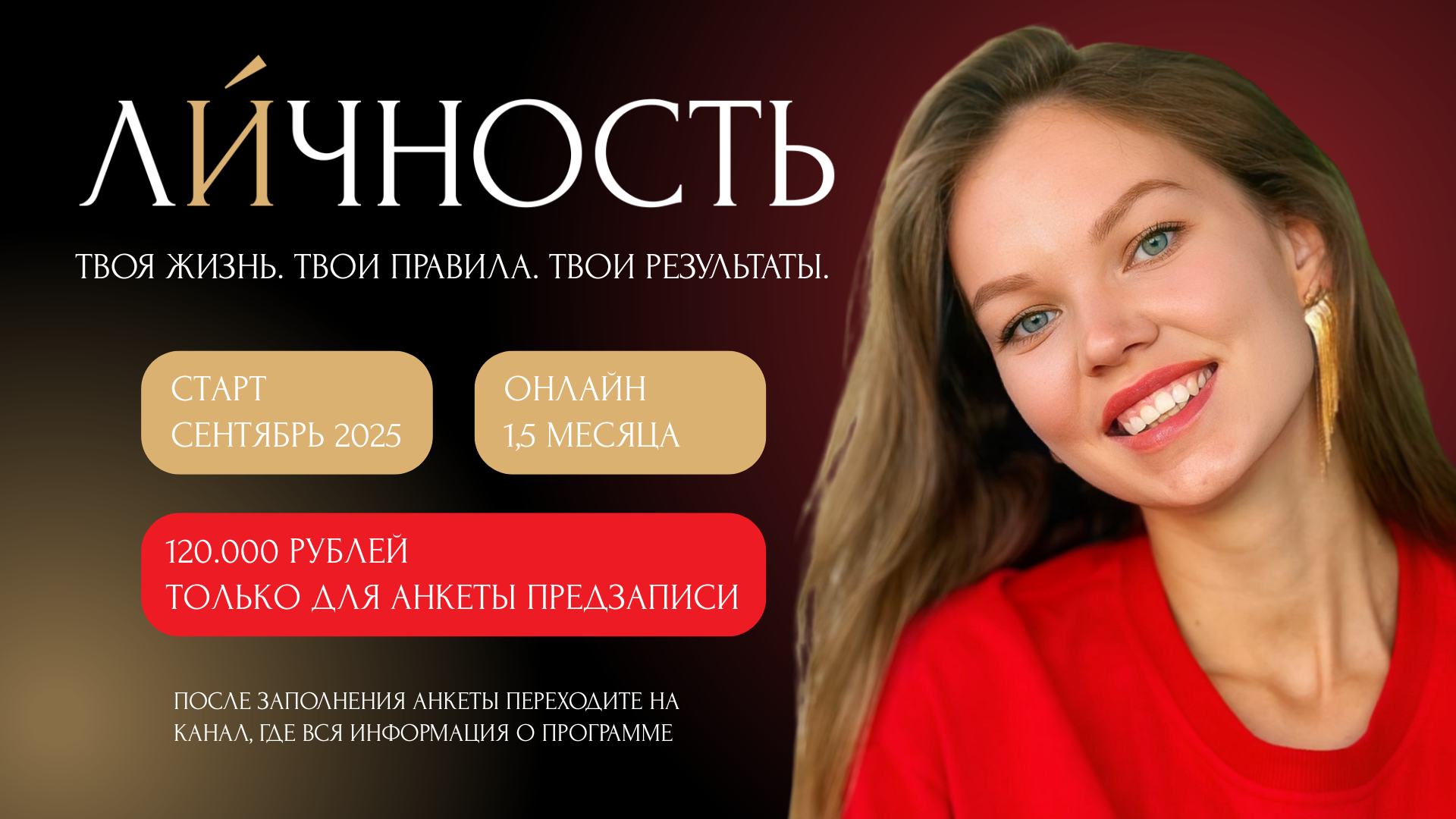 Личность - единственная программа на рынке, где ты за 30 дней полностью перестраиваешь внутренние настройки, убираешь из жизни компромиссы и ограничения, и начинаешь получать результаты, о которых раньше даже не мечтал, но которых всегда заслуживал.